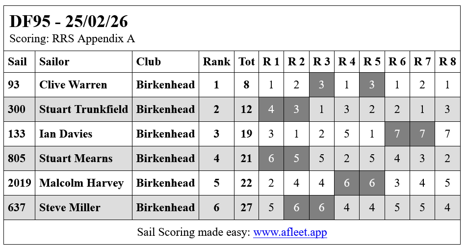 With a ridge of high pressure offering a brief respite from the continuously rainy month of February, it was a sparkling sunny scene that welcomed the seven skippers to Gautby Road. Great to welcome Phillip Barnes of Budworth SC for his first time racing his new 95. Philip and Graham Birkett of Budworth SC have done an amazing job at enthusing 16 of their members to buy DF95’s from a standing start only a few weeks ago and we wish them great success with their fleet.