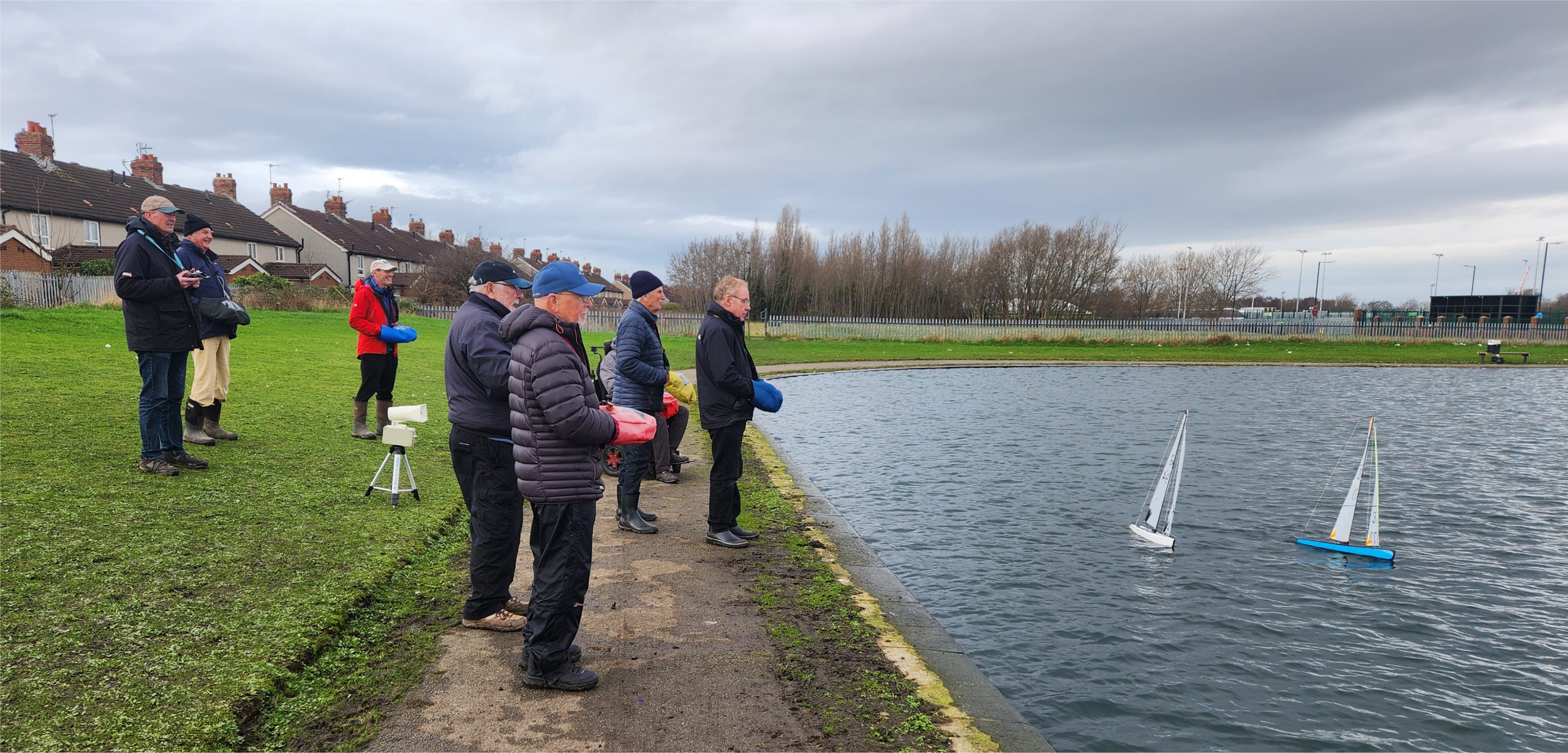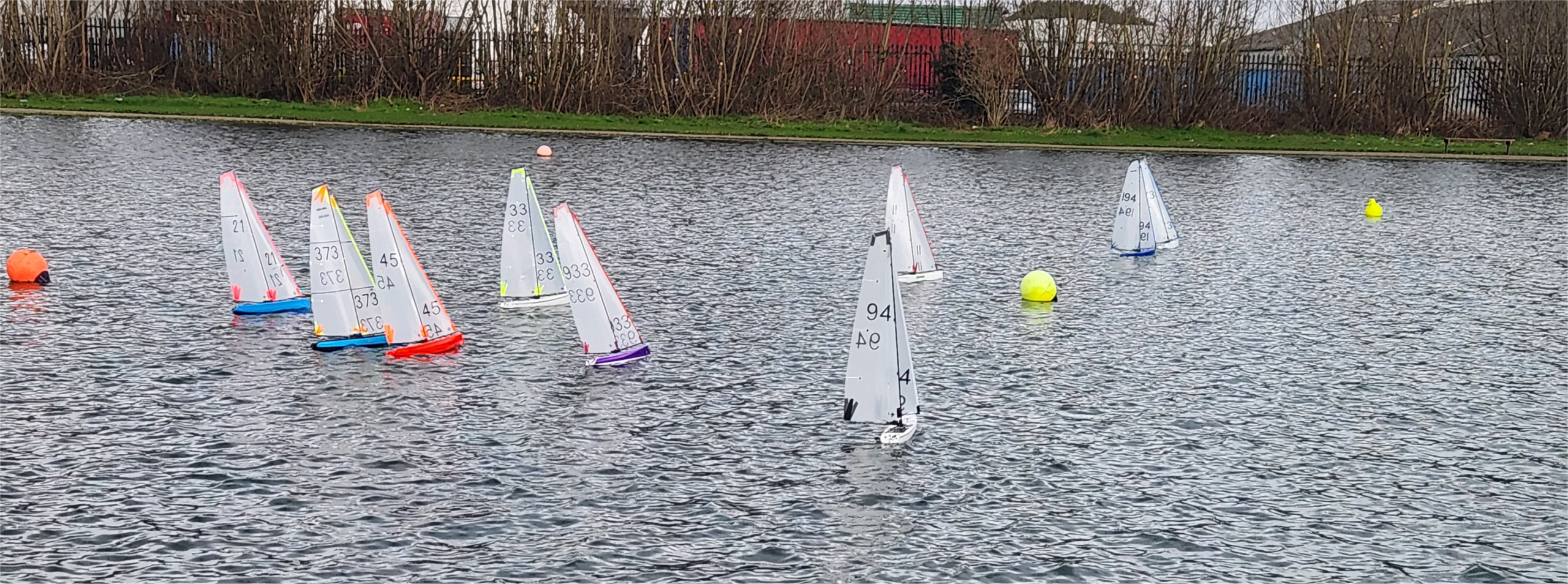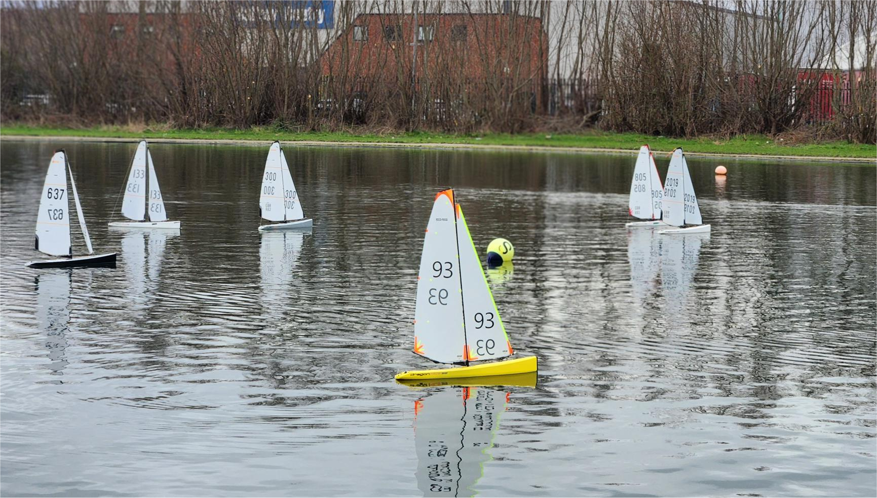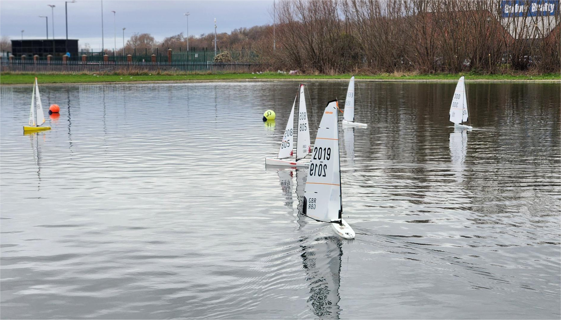 Conditions were shifty as always with the wind direction, and racing was very keen right from the start, with four winners in the first five races, Alan, John, Andrew, and Mike. The other two race winners during the morning were James, and Paul Little who was sailing a brand new hull after his previous one failed. The excitement of winning race five was clearly too much for Mike’s boat which had to be retired with a failed rudder servo, and Stuart missed a couple of races fixing a minor rigging problem.