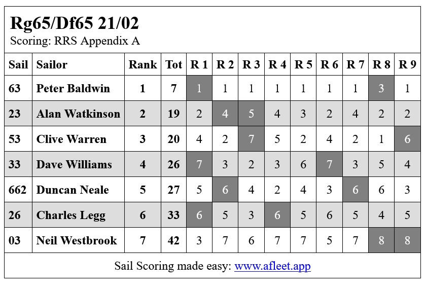 There was a small but enthusiastic bunch of seven sailors for the latest round of the DF/RG65 Winter Series. Three DF65’s turned out along with four RG65’s (all Uno’s), with racing number’s rather depleted with a calendar clash of the RG65 Open at Bournville, losing a potential four sailors who had travelled.