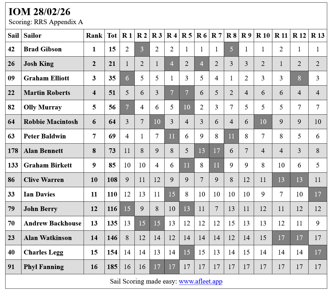 The wind went somewhat left during the morning and got lighter, but John continued at the front by winning two more races to finish on 13 points well clear of the rest of the fleet. Behind John second to fifth was extremely close as shown below, with only 2 points covering the next four boats, with full results shown below.