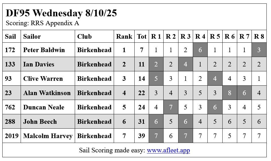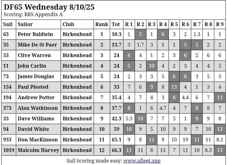 Behind Peter the next 5 or 6 boats swapped places and remained very close. In the end Mike dsp edged away slightly to hold second leaving Clive, John and James tied on points for third / fourth / fifth, and then Paul, Andrew and Alan in 6th / 7th and 8th within 5 points. Close racing.