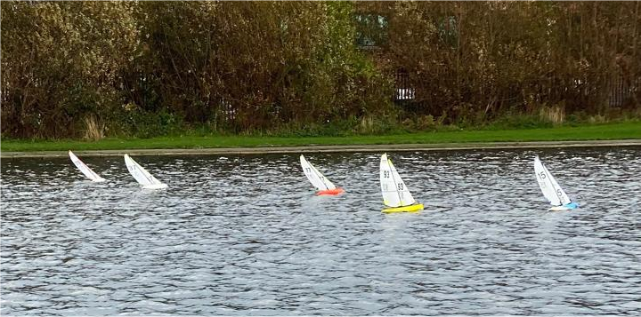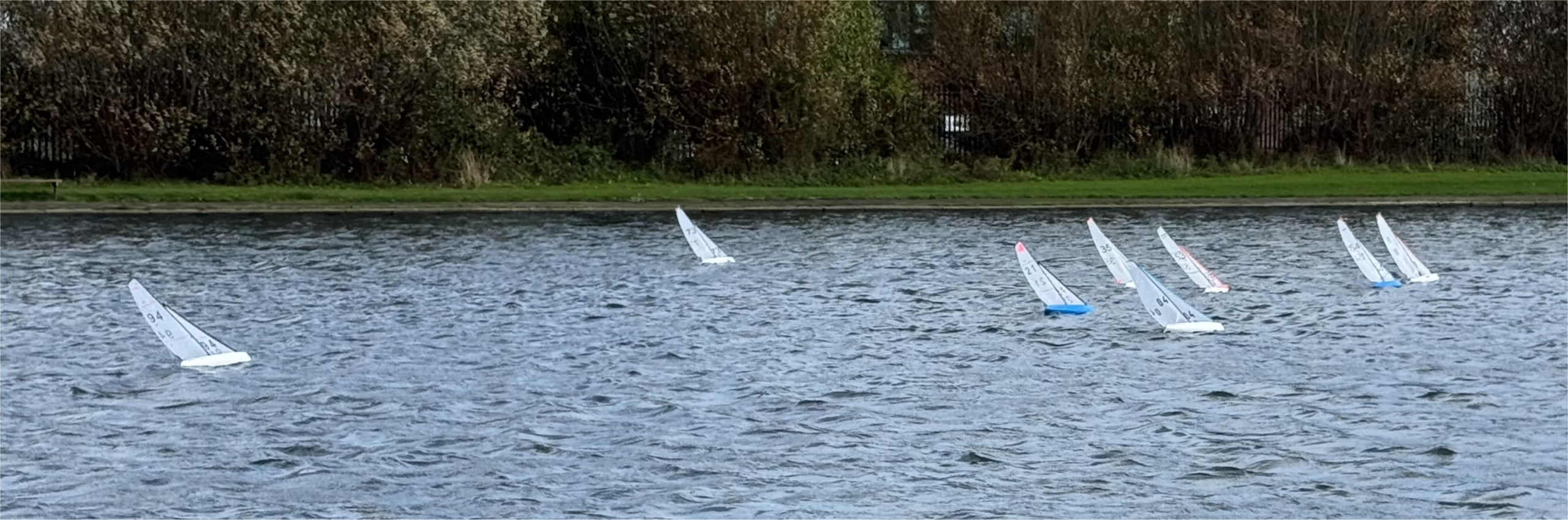 A quick change to B rig, and somewhat in the running order. Mikedsp had been on the pace on A rig, but successfully found the slow buttons on B rig, while PaulP, John C, James, Clive and PaulL all showed excellent boatspeed resulting in some very close racing. Unfortunately, this had eliminated Andy Mearns as he had only brought A+ but he very kindly agreed to stay and RO for the morning.