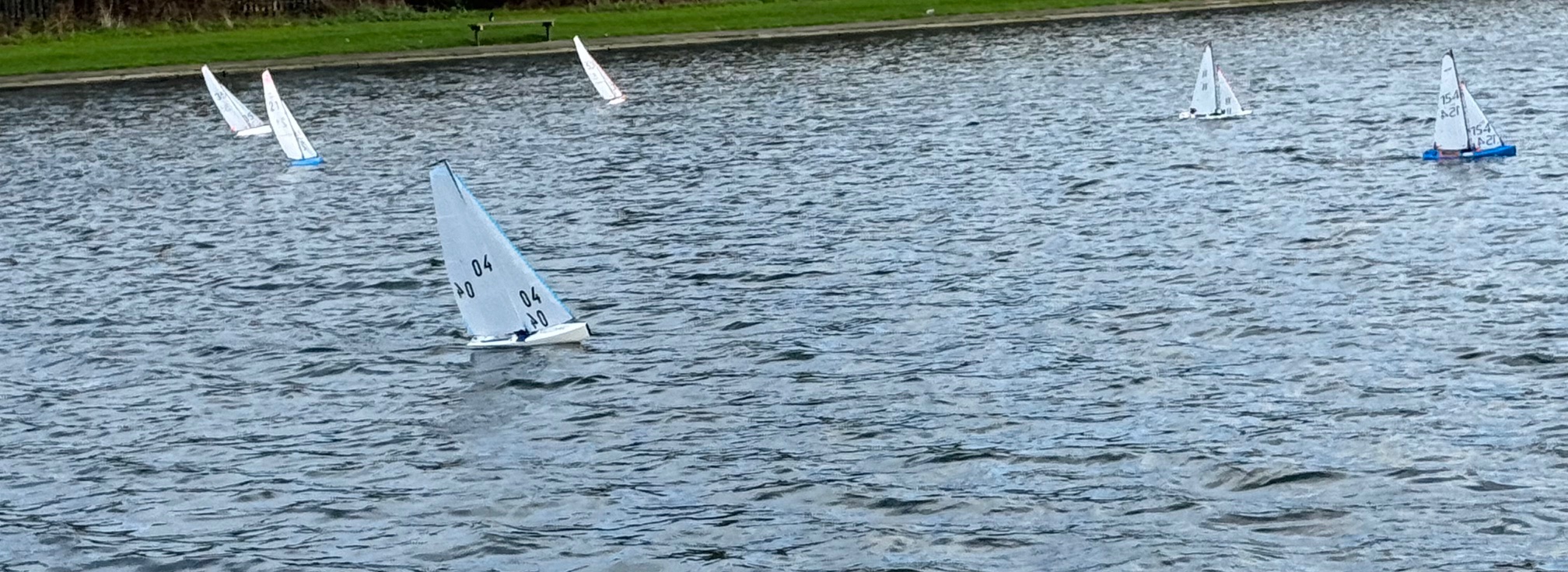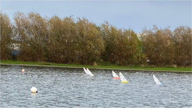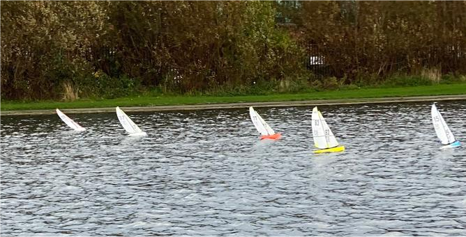 The gusty nominally southerly breeze remained from the clubhouse end, which swung easterly at times meant the difficulties from the morning continued into the afternoon for the DF95 racing. Unfortunately, only 5 skippers showed up/remained, perhaps a hangover from the DF95 open held at the weekend. The choice of rig was B, and after a bit of re-rigging of Steves boat, first time the B rig had been used, we were ready to go, 5 minutes later than normal. The same standard course as the morning was used, and as normal with a small fleet the starts were self monitored and the first to finish recorded the race result.