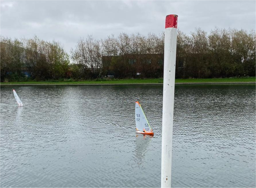 Commodore Dave chased everyone for a prompt – or even early – start on a standard course. The existing start mark positions offered a choice between a very starboard – or a very port – biased start line. It was so light and fluky that no one reckoned it was worth paddling to do a reset so the starboard biased line was chosen as the “least worst” option. This full course was used for race one, but as the race duration was close to 20 minutes overall it was then agreed to run a shortened Port hand course using the finish mark as the windward mark, and the leeward gate as a leeward mark and spreader. This worked well and enabled the fleet to get in six races until on the seventh, as noted below, the wind went to nothing although Alan had sailed a perfect race and was the only boat to get across the line although Richard got very close before all the other competitors were finished on the water