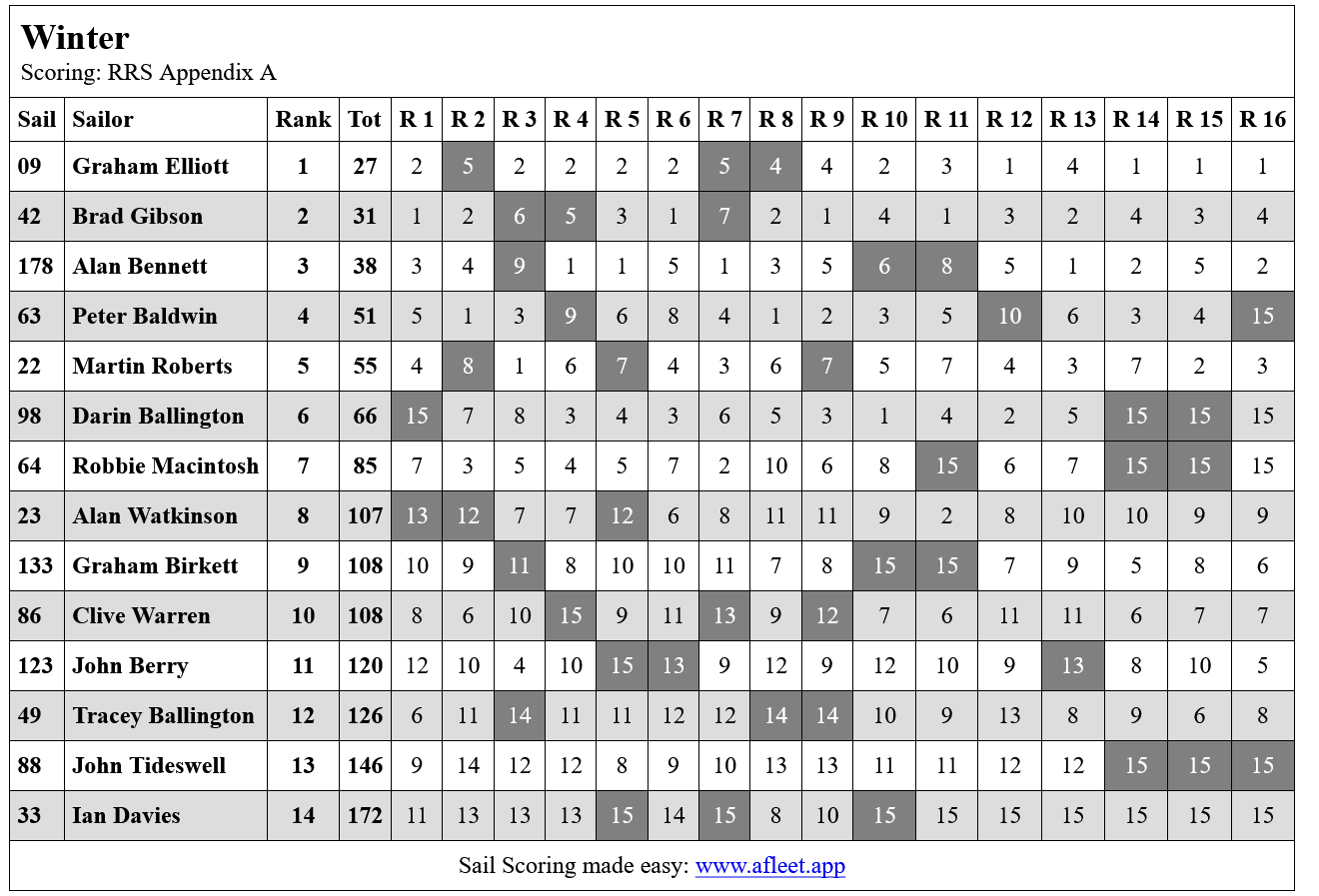 A good finish in the final 3 races gave Graham Elliott the win from Brad Gibson with Alan Bennett rounding off the podium. Other notables today were Alan Watkinson with great speed and managing a 2nd in race 11, also Graham Birkett returning from a break with a very strong final 5 races, Tracey Ballington getting 5 single digit scores in the final 6 races.