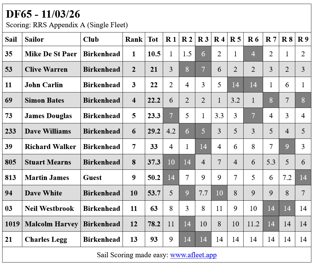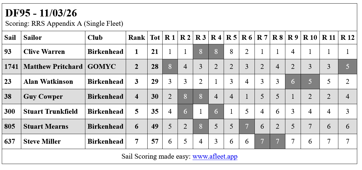 Overall a great mornings racing which tested heavy air sailing skills and setup. Very nice to welcome Martin James back after a layoff and thanks as always to Dave W, and Malcolm for the results.