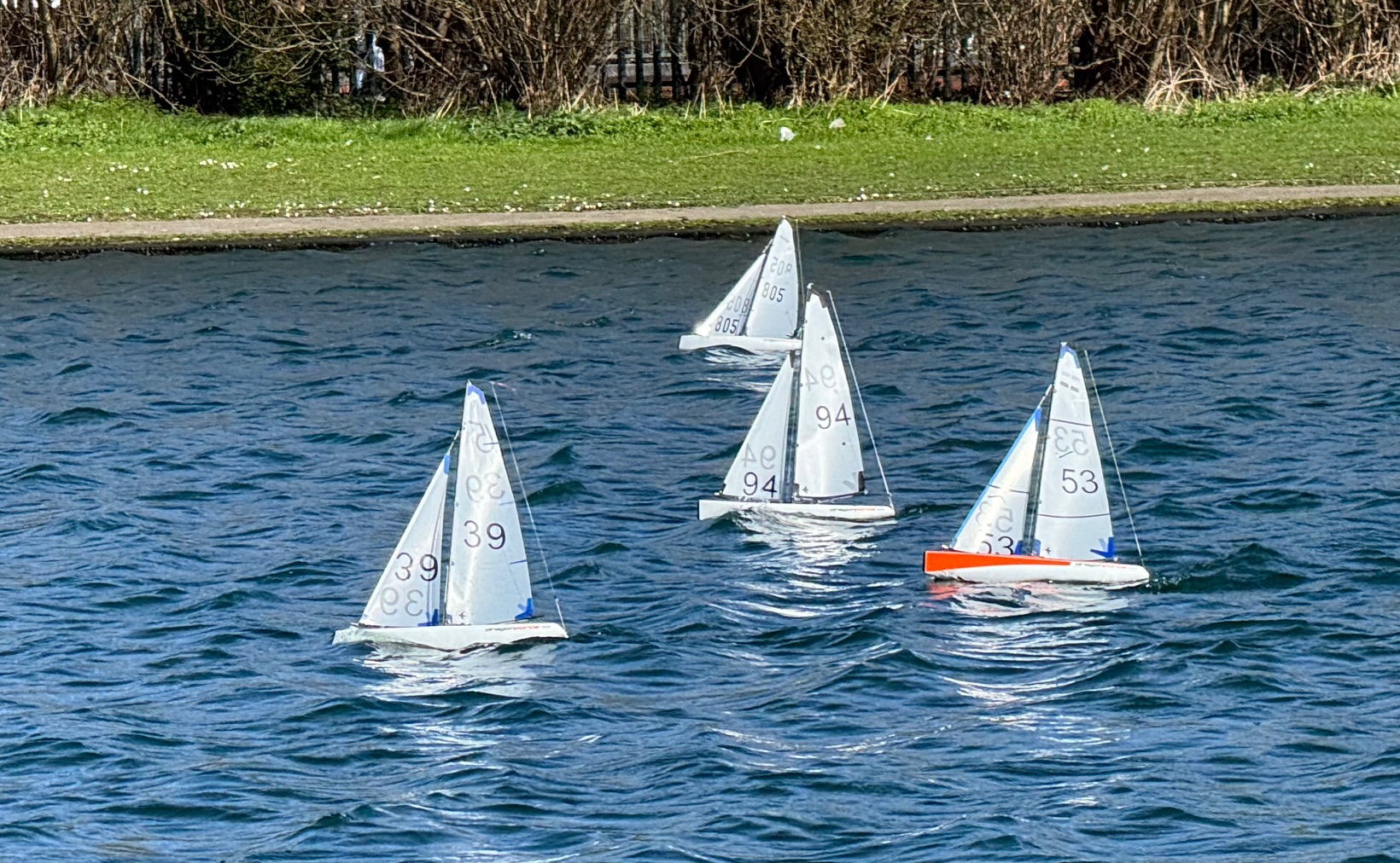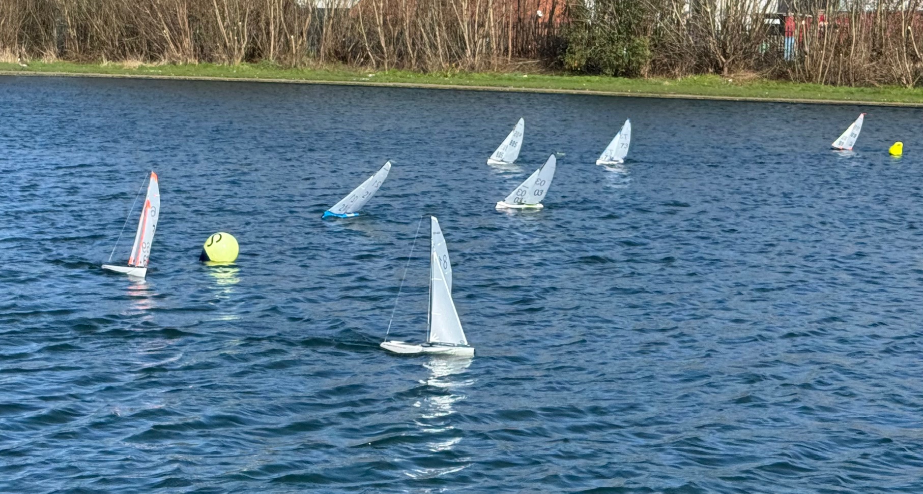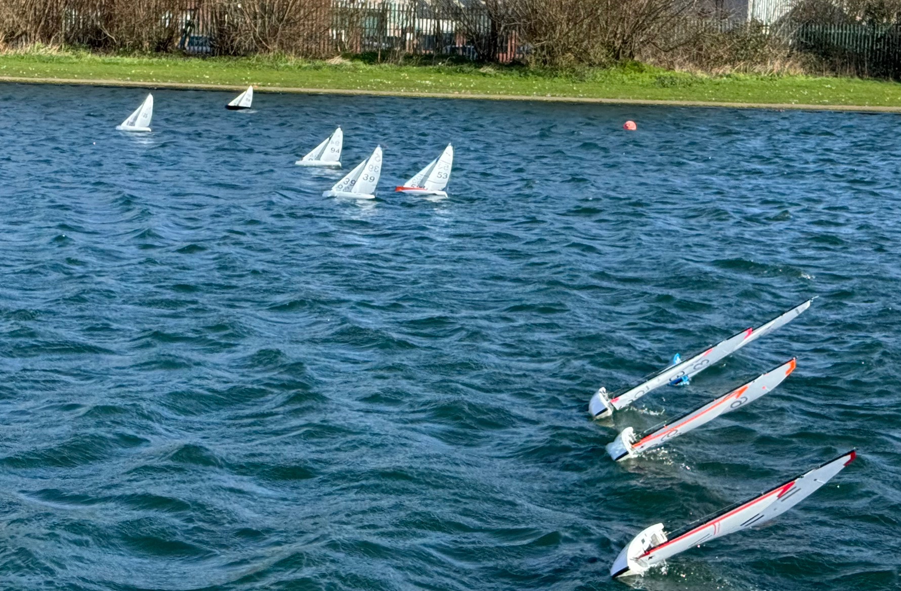 Following on from the morning, 8 skippers including Matt Pritchard from GOMYC got their boats prepared for the afternoon. The sun was shining, the wind was generally westerly which in real terms meant straight down the lake from the far end with a slight bias from the houses. A similar course to the morning was used, the only difference being we used a different start line as the outer transit marker had drifted about 10yds downwind making the line too port bias, as fortune had it, the inner gate mark and the new position of the outer transit was a perfect line. The wind had freshened a little from the morning, which made the choice of rig a top end B. It would prove a test of durability particularly early doors when a number of rig weaknesses were found out by the strong gusts.