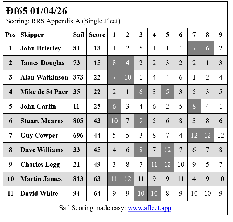 John B showed his experience and class by winning 4 of the 9 races sailed to win by two points from James who took a couple of races to get going but thereafter sailed very consistently to a close second place.
