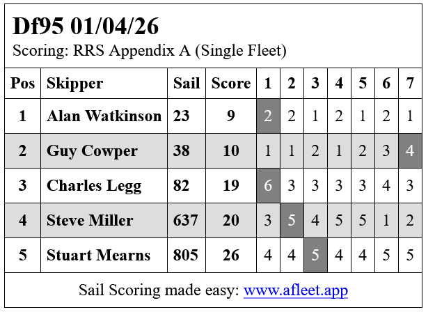Alan was the best of the rest, beating Mike on countback for third and closely followed by John in fifth. Very nice to welcome Martin James back and a well done to Stuart Mearns who is sailing quicker every time and finished the day in sixth.
