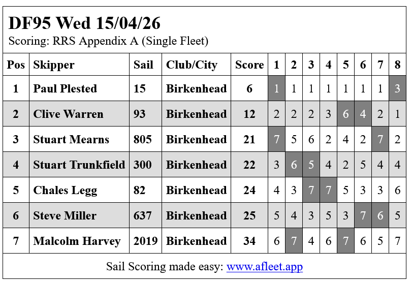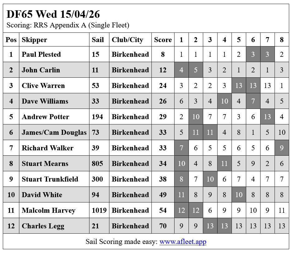 James Douglas was joined on the day by his son, Cam, who took turns racing 73, with James hopping over to Dave William’s boat on at least one occasion. Richard Walker, Stuart Mearns and Stuart Trunkfield (first time with his DF65) all featured at or near the front of the fleet in several races, but struggled to hang on through to the finish, apart from Stuart M who did bag a 2nd in race seven. With only five points separating them, Richard came out on top in this mid fleet tussle.