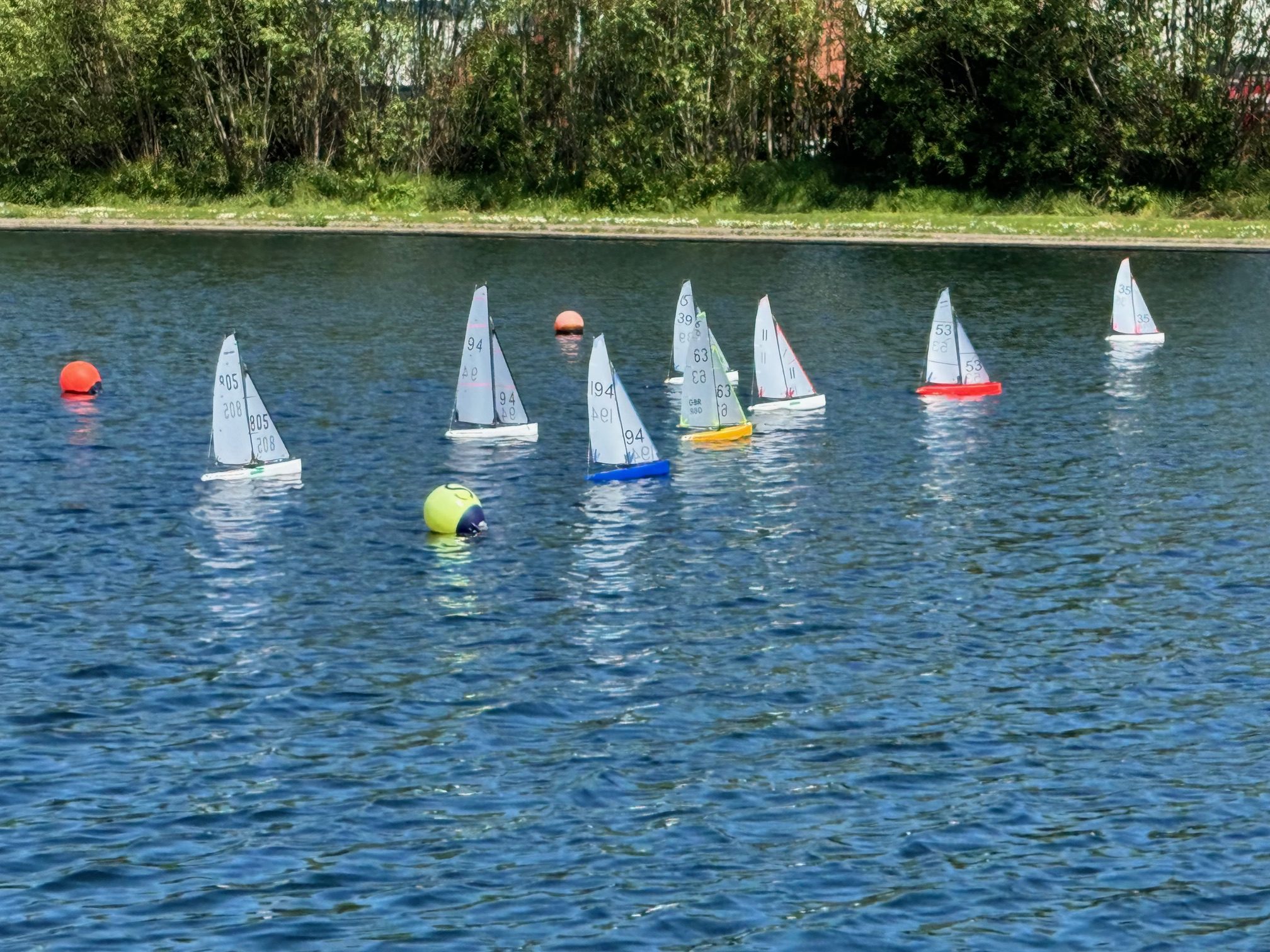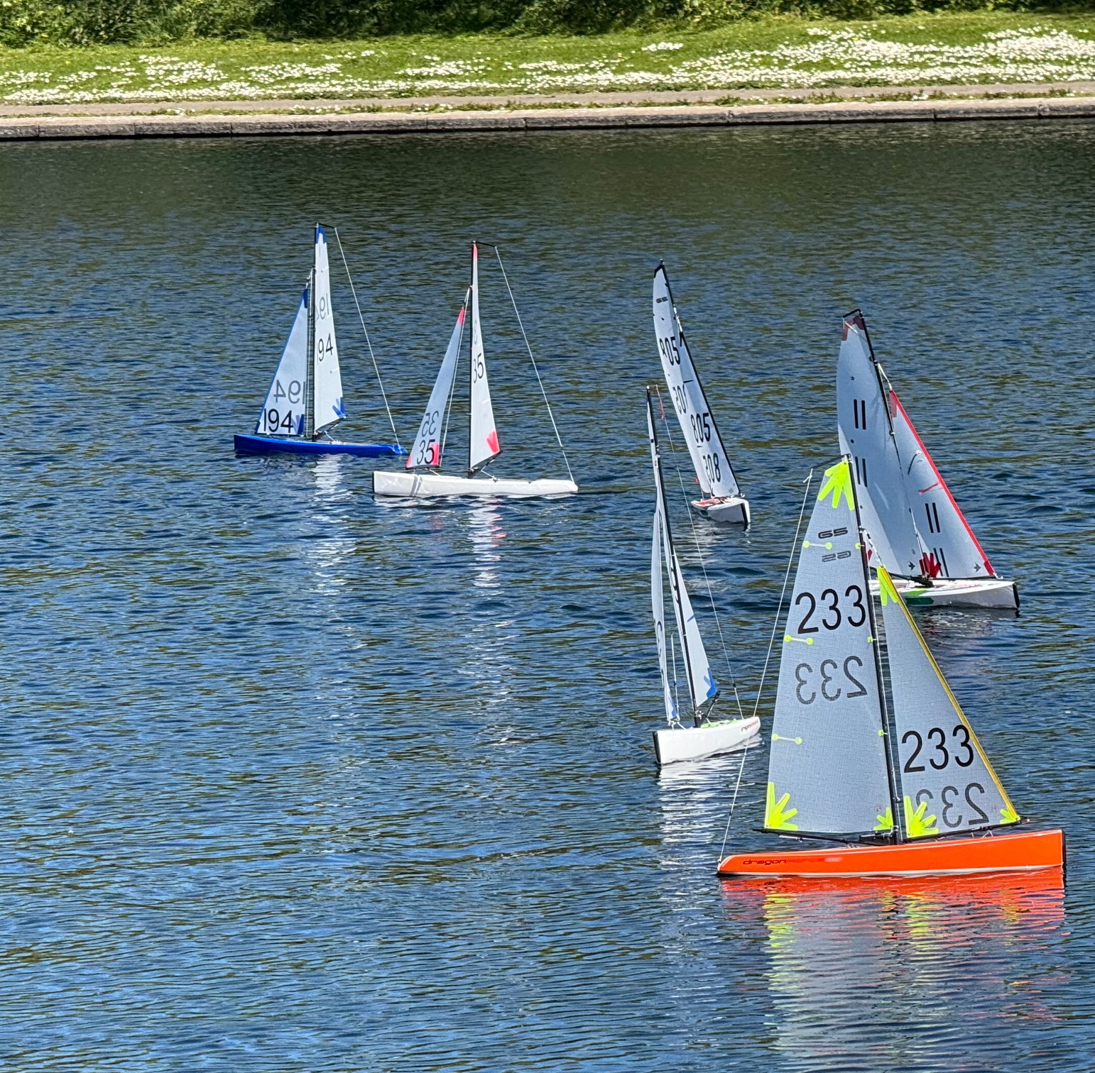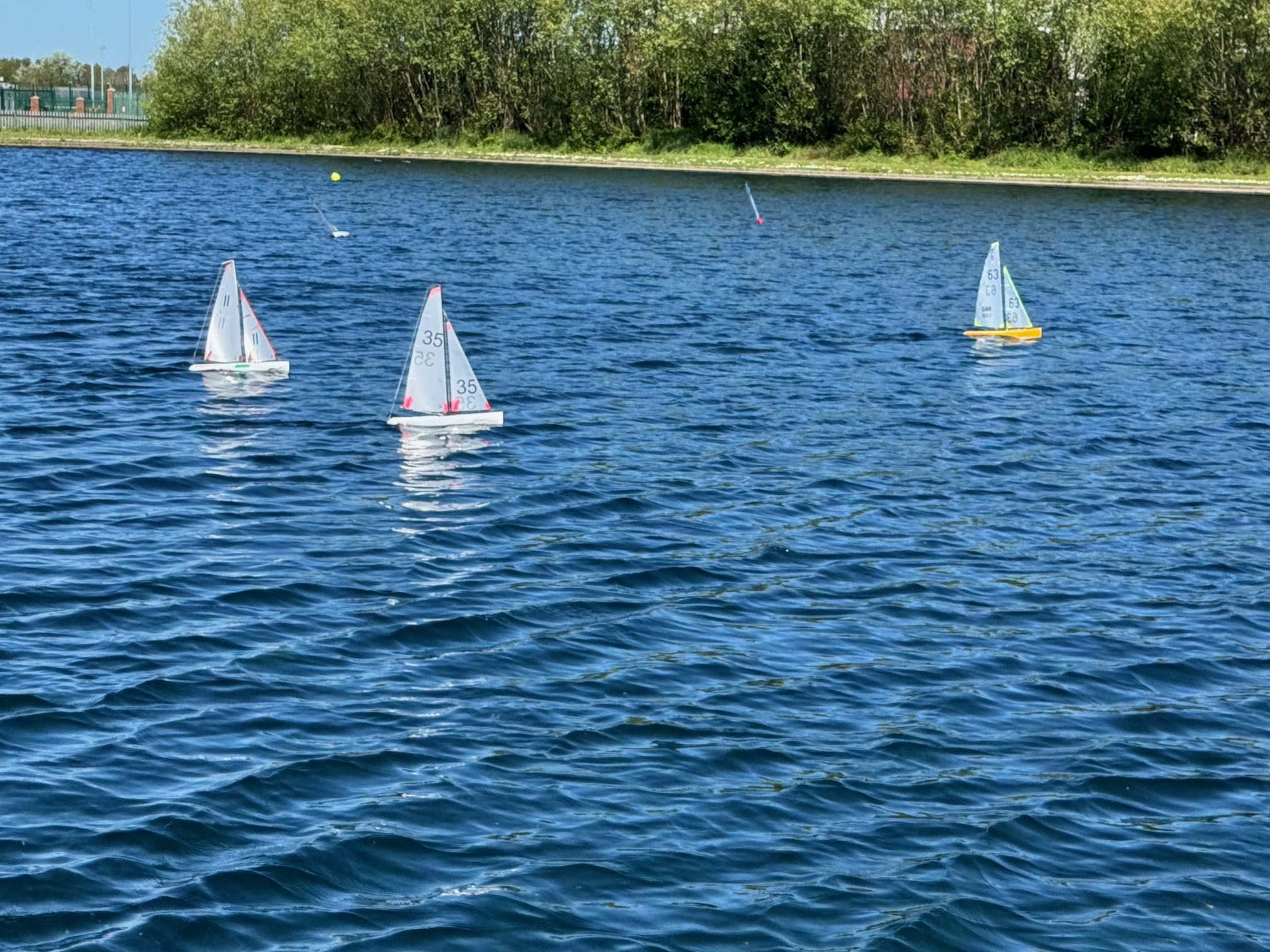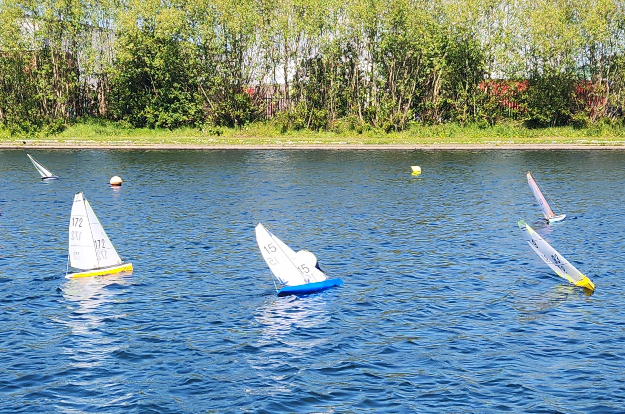 Nine skippers took to the water to enjoy the challenges. The easterly wind direction always throws up some tricky sailing with a lot of decisions for the helm, where to start on the line, although port tack was the tack to take you down the lake it wasn’t strong enough to clear starboard boats by the time you had tacked and built up speed again. It was therefore a case of how quick could you get onto port and away. The non clubhouse side was also in the lee of the trees on that side with all the problems they could cause.